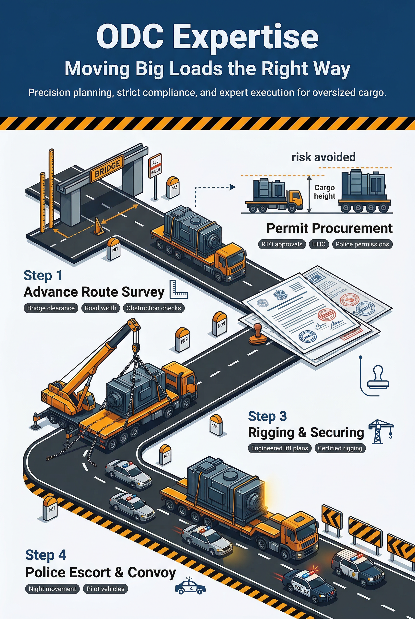 Oversized cargo is not just a logistics challenge — it's a compliance one. A single overlooked bridge height or missing permit can ground your move for days. Our ODC team has managed hundreds of such moves and knows every step of the process.