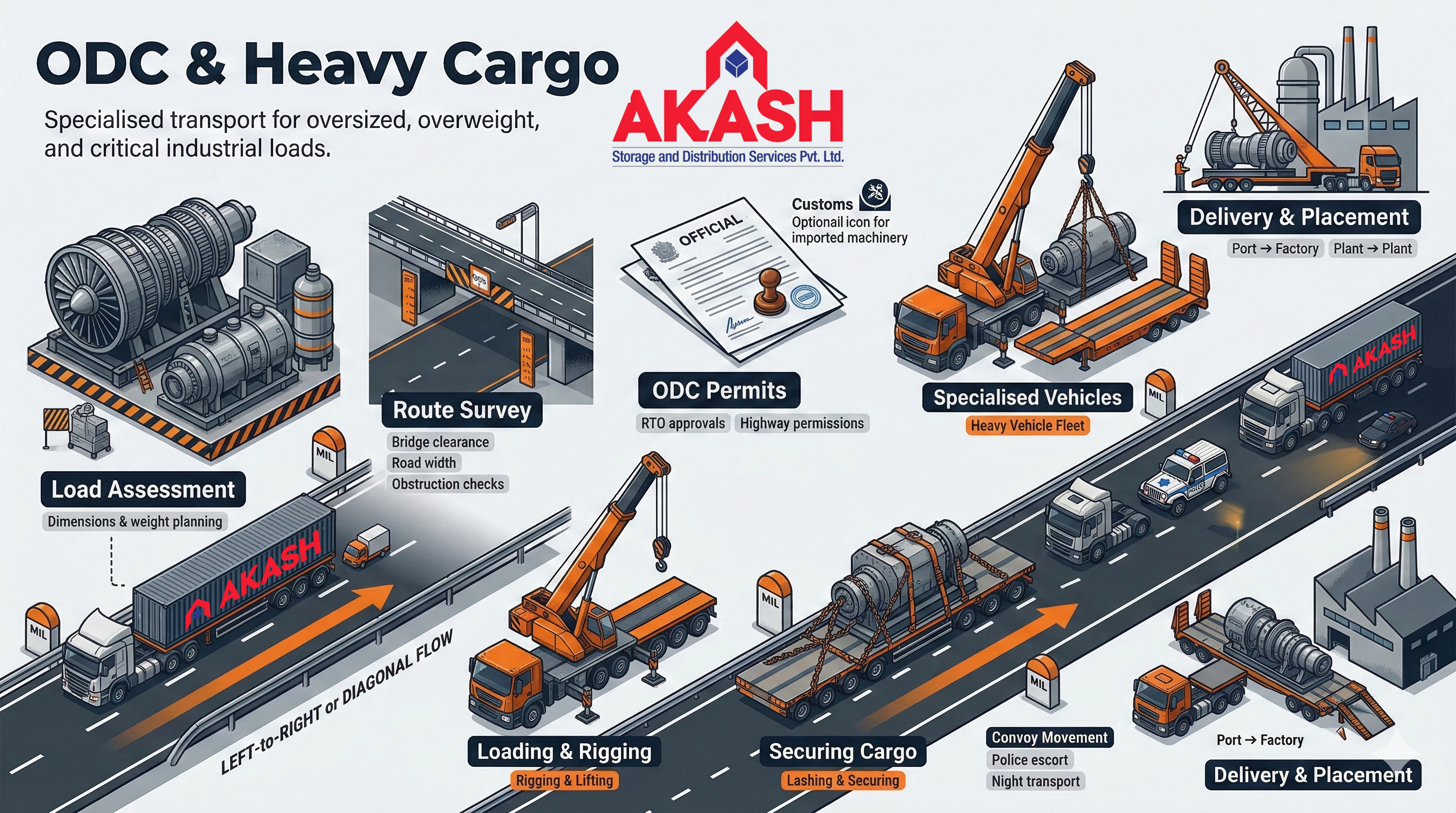 A detailed project plan is created — vehicle selection, crew deployment, sequence of activities, and timeline. ODC permits and route clearances are applied for well in advance of the move date.