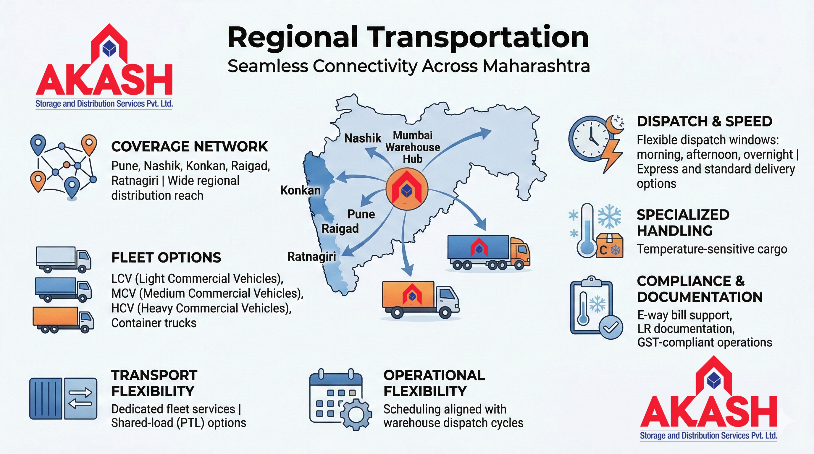 Connecting your warehouse to customers across Maharashtra — Pune, Nashik, Konkan, Raigad, and beyond — with a trusted and well-maintained fleet of LCVs, MCVs, and HCVs. Dedicated and shared-load options available.