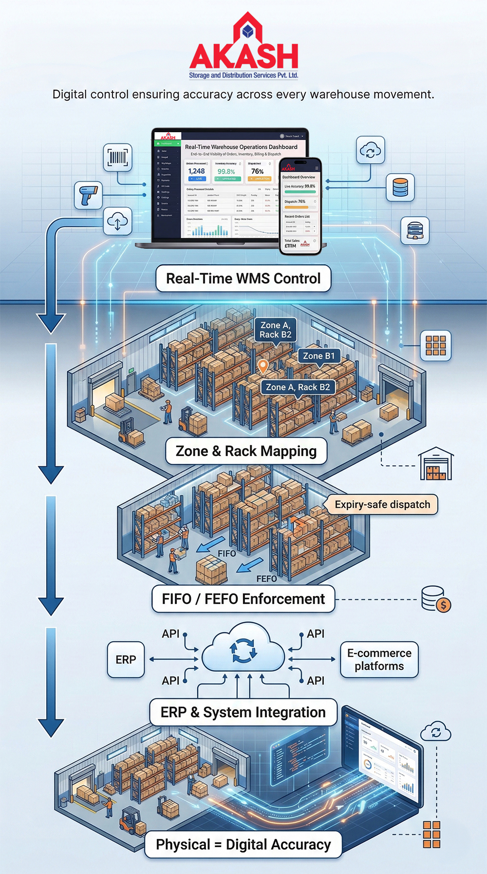Akash supports better warehouse control through its proprietary Flow Management System (FMS) integrated with WMS and client dashboard access — helping clients monitor stock, GRN status, dispatch readiness and inventory movement in real time.